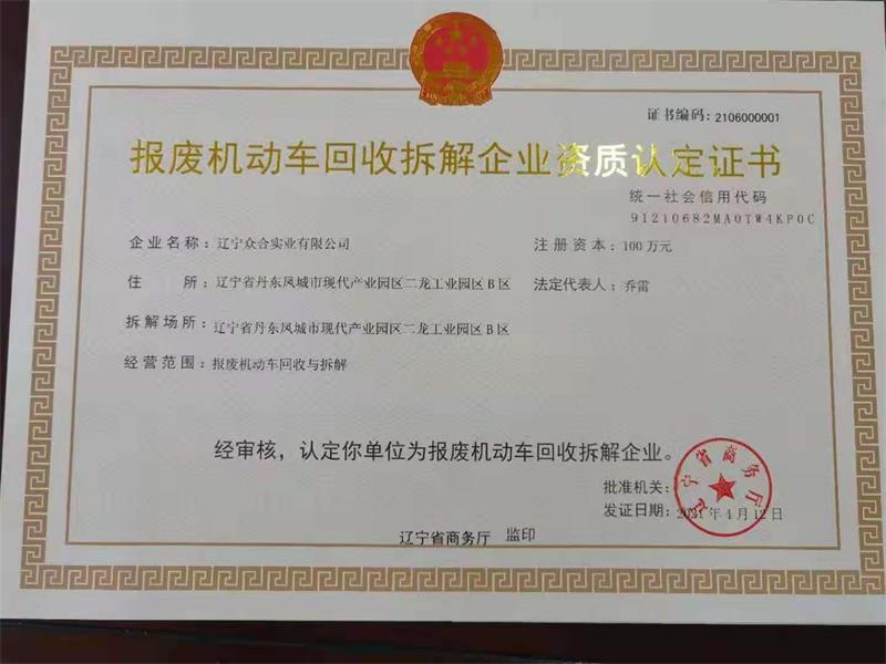 热烈祝贺,路友东北客户。通过报废汽车拆解项目,资质认定。